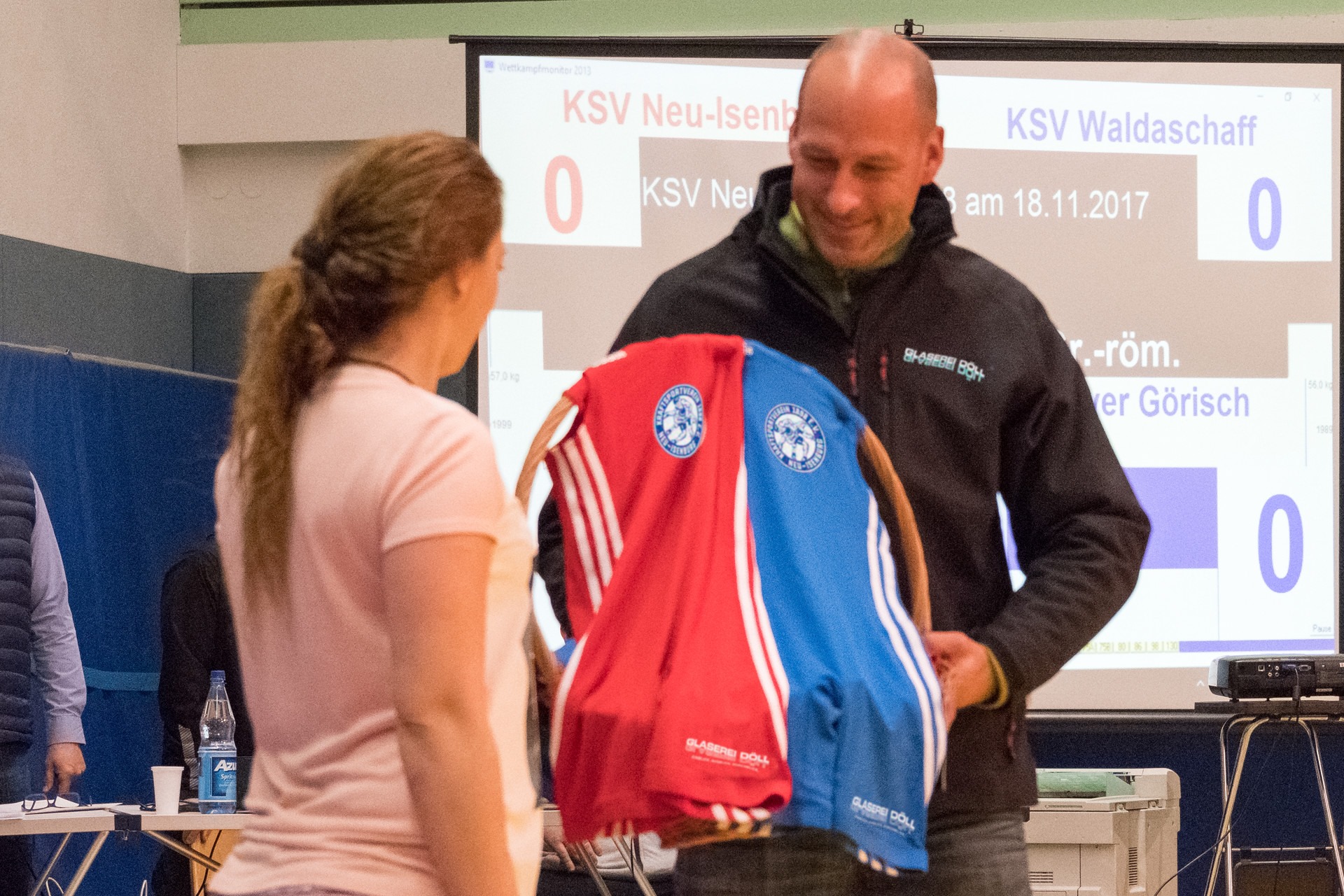 Herr Müller, vertretend für die Firma Glaserei Döll, übergab die Trikots mit KSV-Aufdruck und dem Logo unseres Sponsors am Samstagabend an unsere Sportwartin Desislava Urosheva.